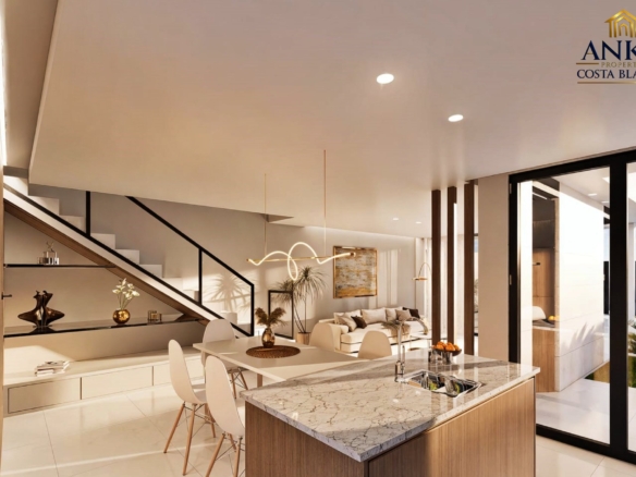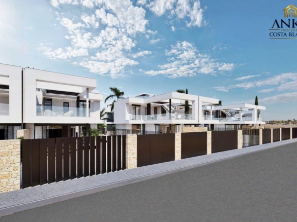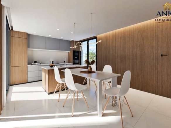 Die Innenräume verfügen über 3 Schlafzimmer und 3 Badezimmer, verteilt auf einen funktionalen Grundriss, der natürliches Licht und offene Räume priorisiert. Der Wohn- und Essbereich integriert sich nahtlos in eine moderne offene Küche und schafft eine warme und zeitgemäße Atmosphäre. Hochwertige Ausstattungen umfassen wärmegedämmte Fenster, Doppelverglasung, motorisierte Rollläden in den Schlafzimmern, komplett ausgestattete Badezimmer mit Glasabtrennungen sowie vorinstallierte Kanalklimaanlagen. Nachhaltigkeit ist ein zentrales Element, mit Solarpaneelen zur Eigenversorgung und automatischer Gartenbewässerung.