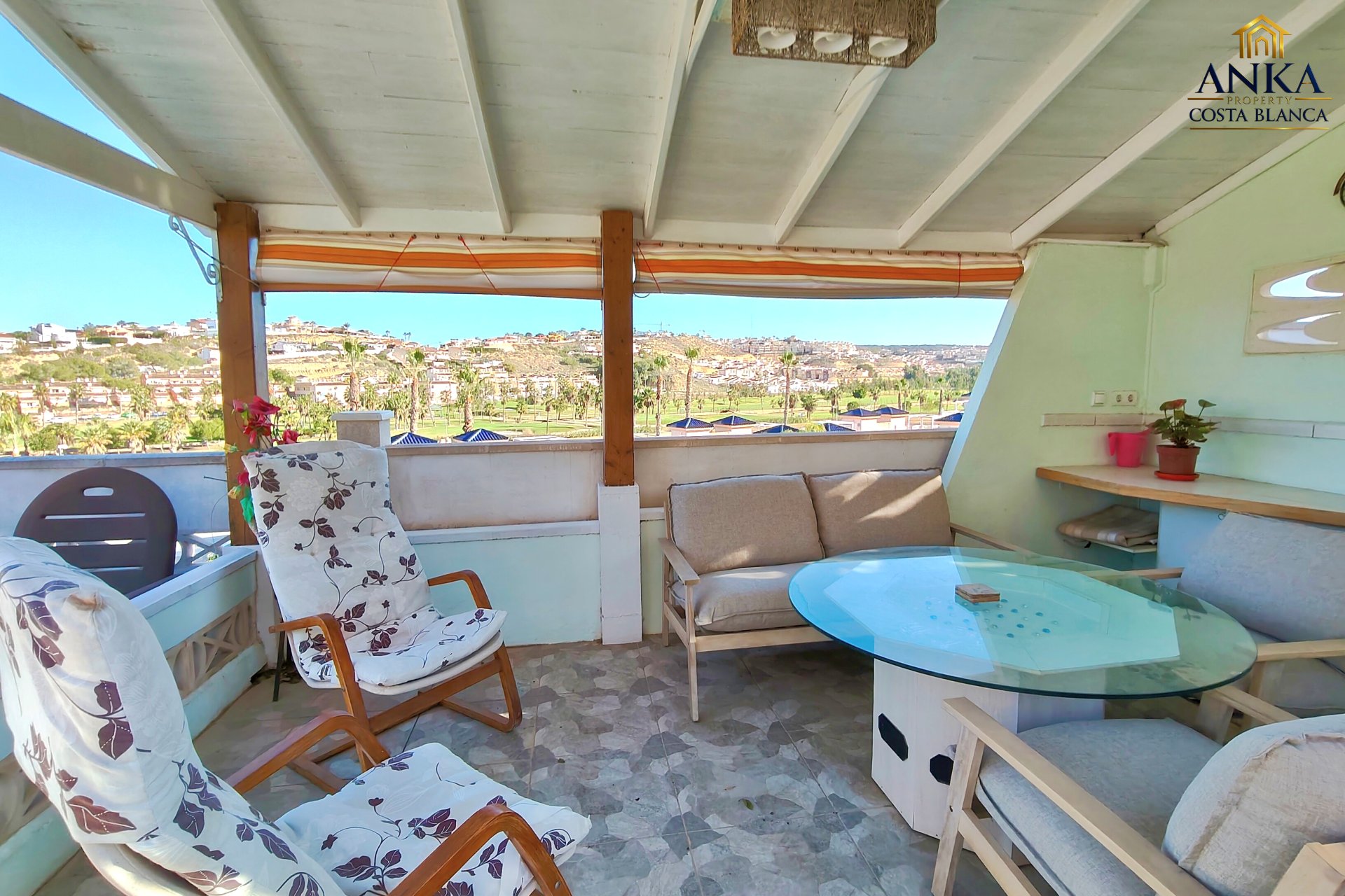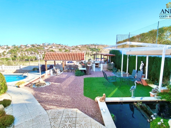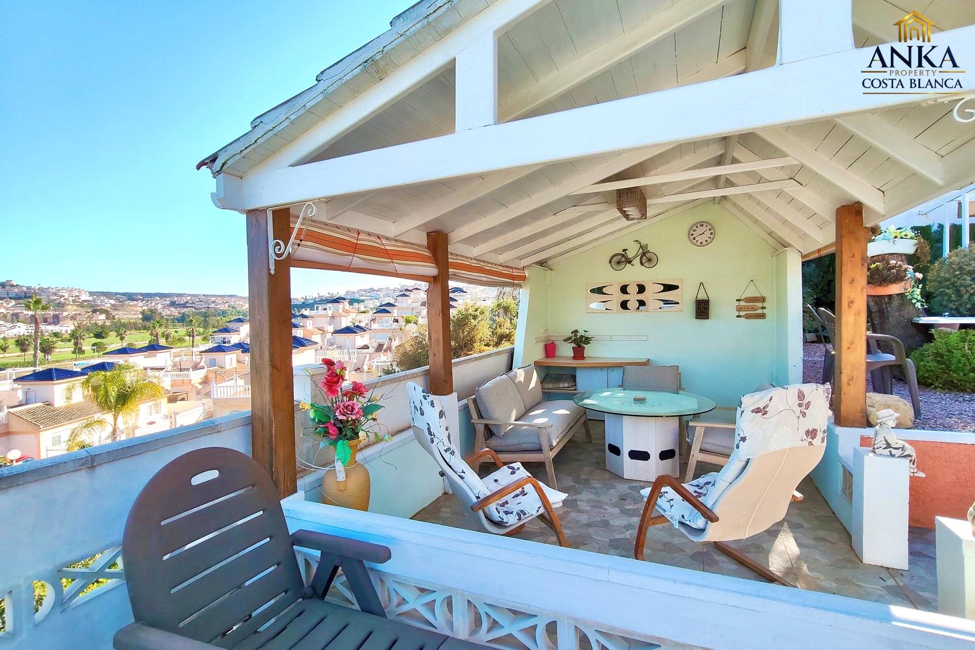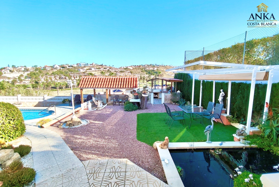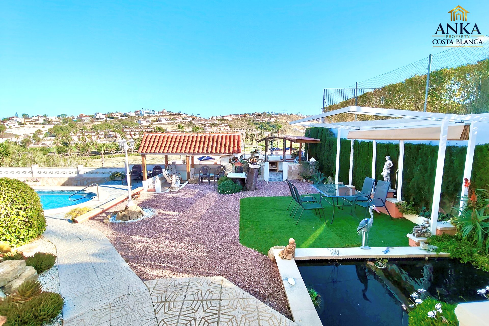 Implantée sur un terrain généreux d’environ 710 m², la villa offre de magnifiques vues ouvertes sur le parcours de golf et de superbes espaces extérieurs. L’extérieur comprend une piscine privée, un bassin décoratif avec poissons, plusieurs terrasses aménagées pour se détendre ou recevoir, un carport, des espaces de rangement ainsi qu’une zone buanderie, le tout parfaitement pensé pour profiter du climat méditerranéen.