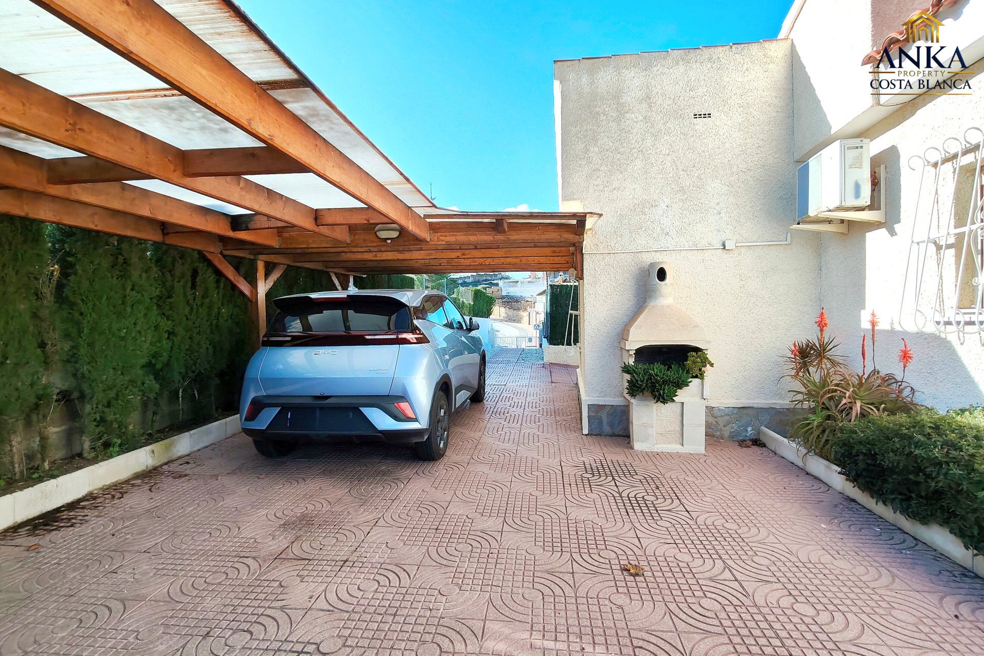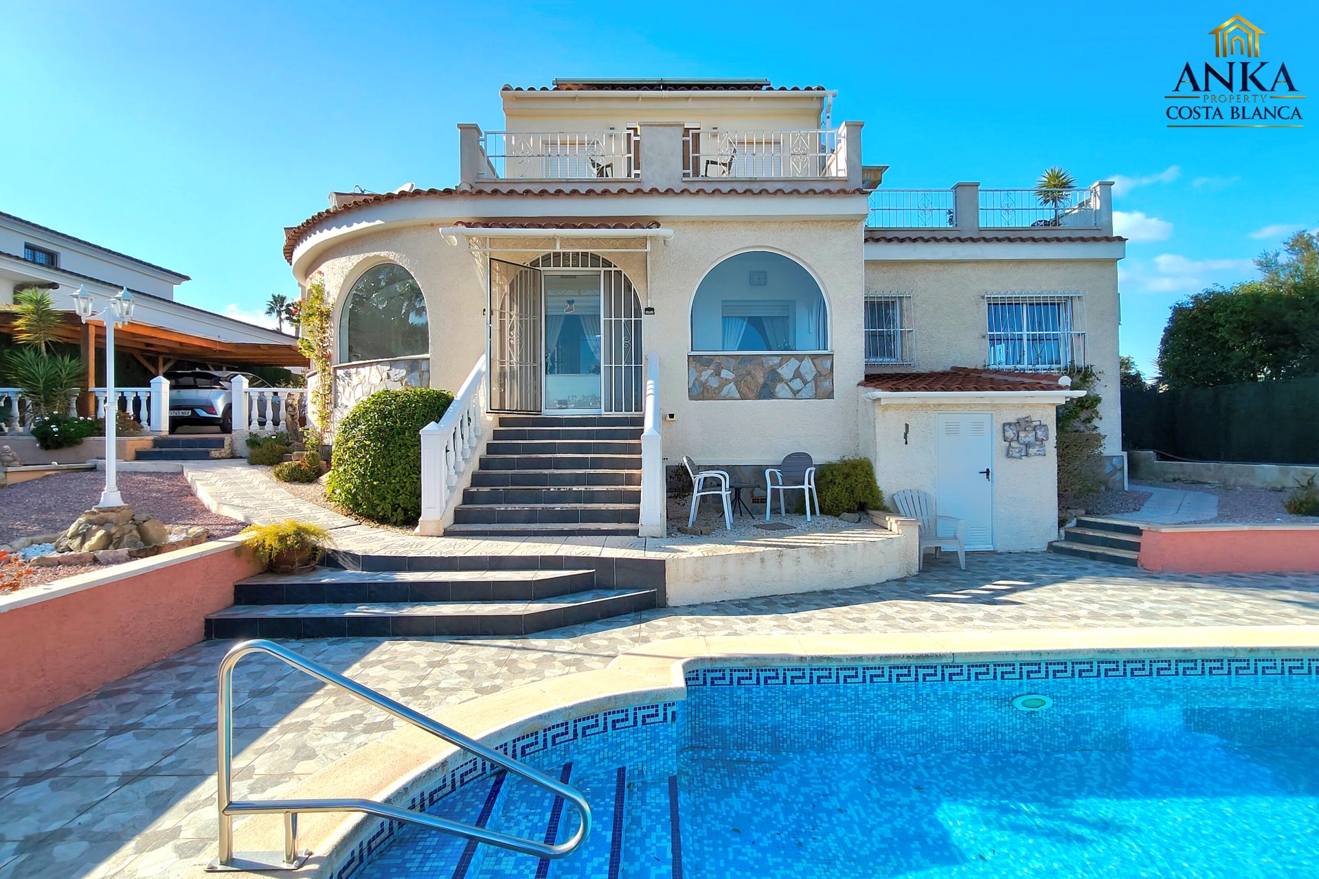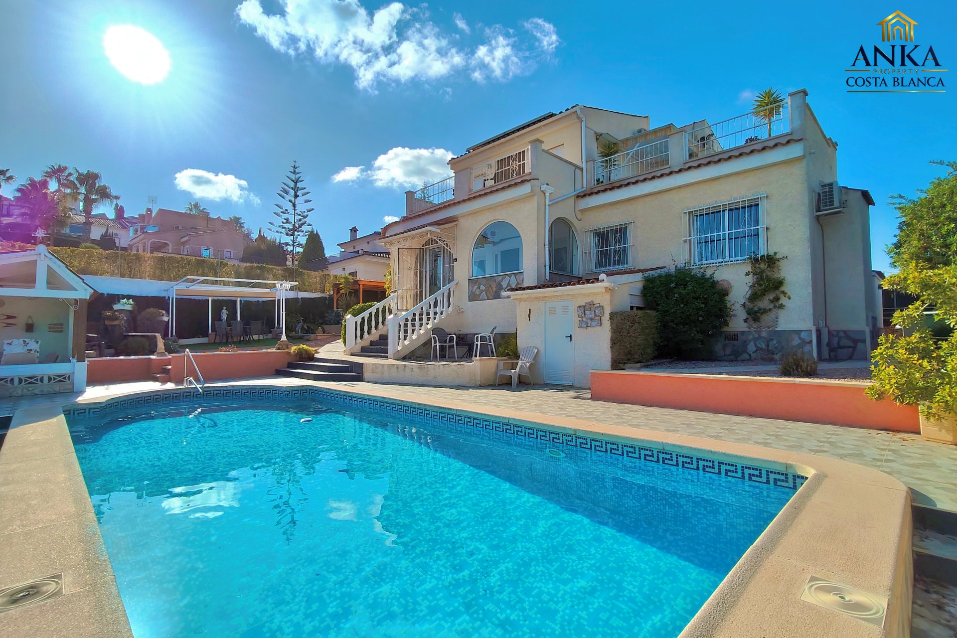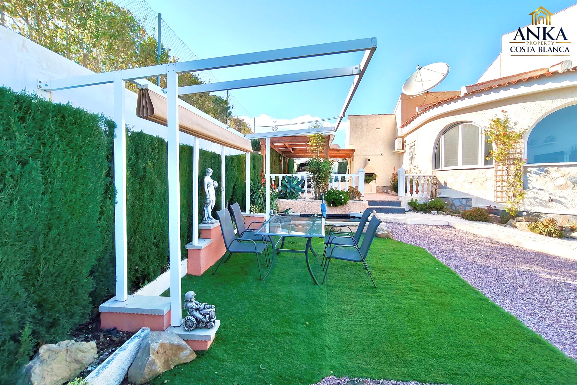 Implantée sur un terrain généreux d’environ 710 m², la villa offre de magnifiques vues ouvertes sur le parcours de golf et de superbes espaces extérieurs. L’extérieur comprend une piscine privée, un bassin décoratif avec poissons, plusieurs terrasses aménagées pour se détendre ou recevoir, un carport, des espaces de rangement ainsi qu’une zone buanderie, le tout parfaitement pensé pour profiter du climat méditerranéen.