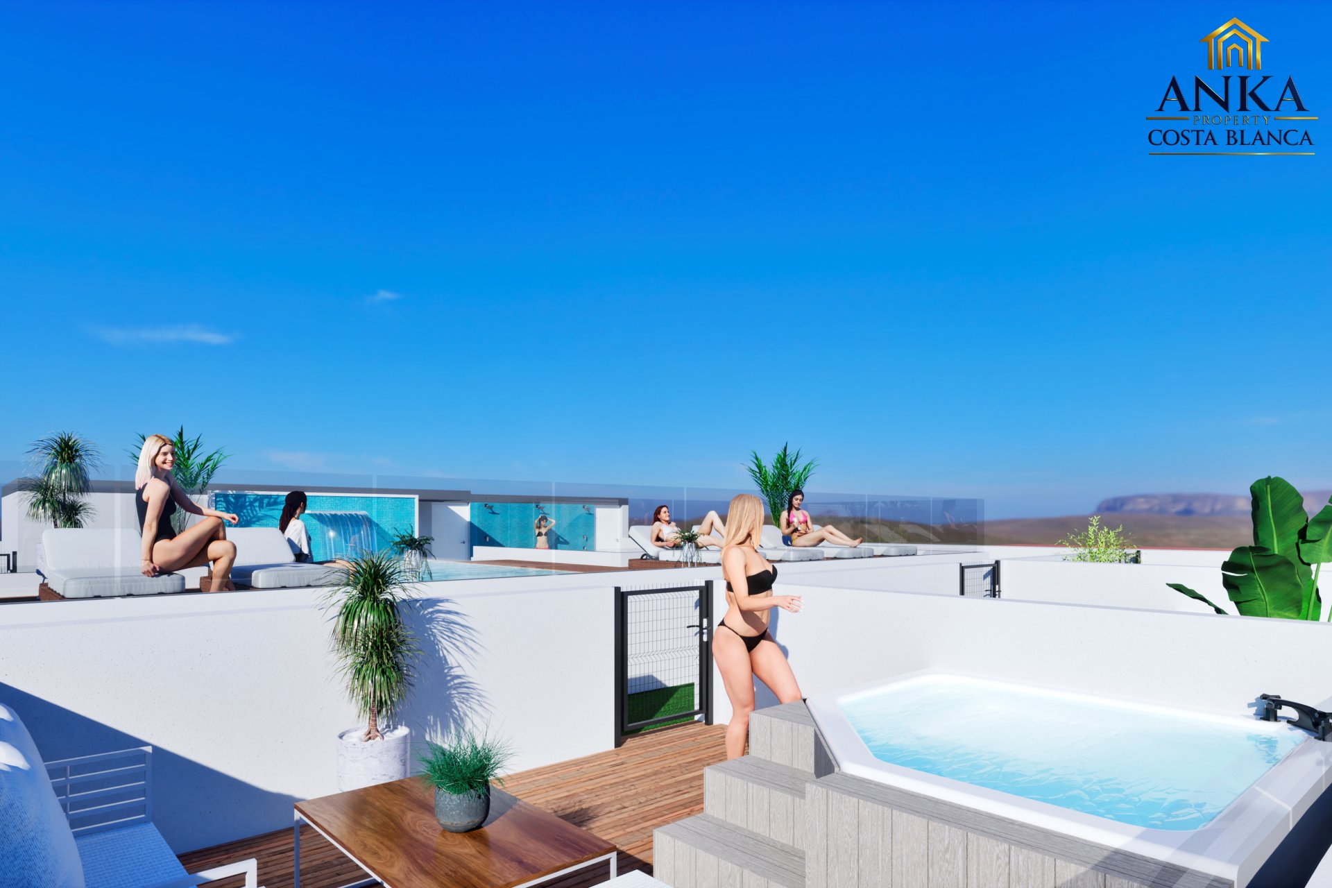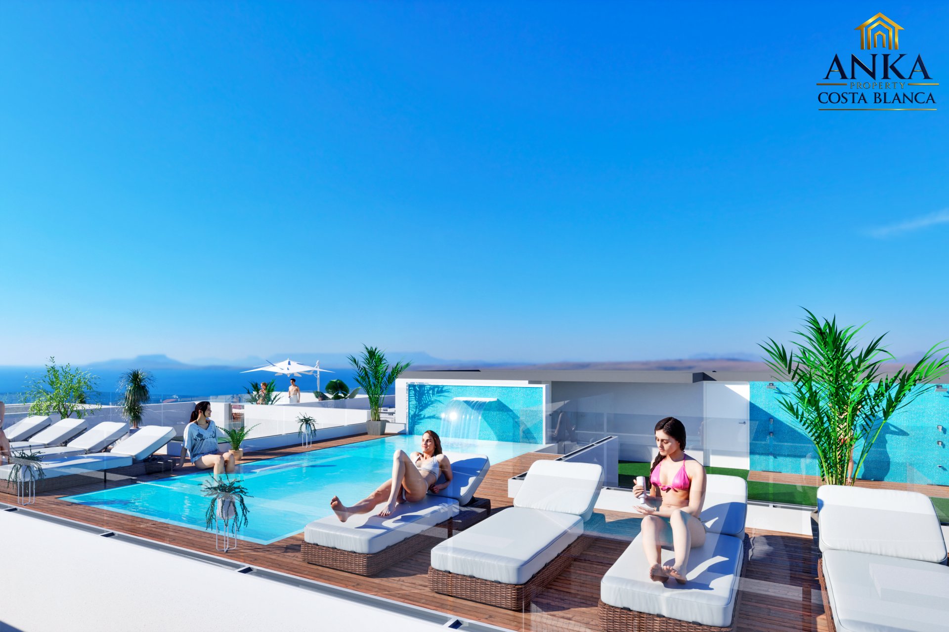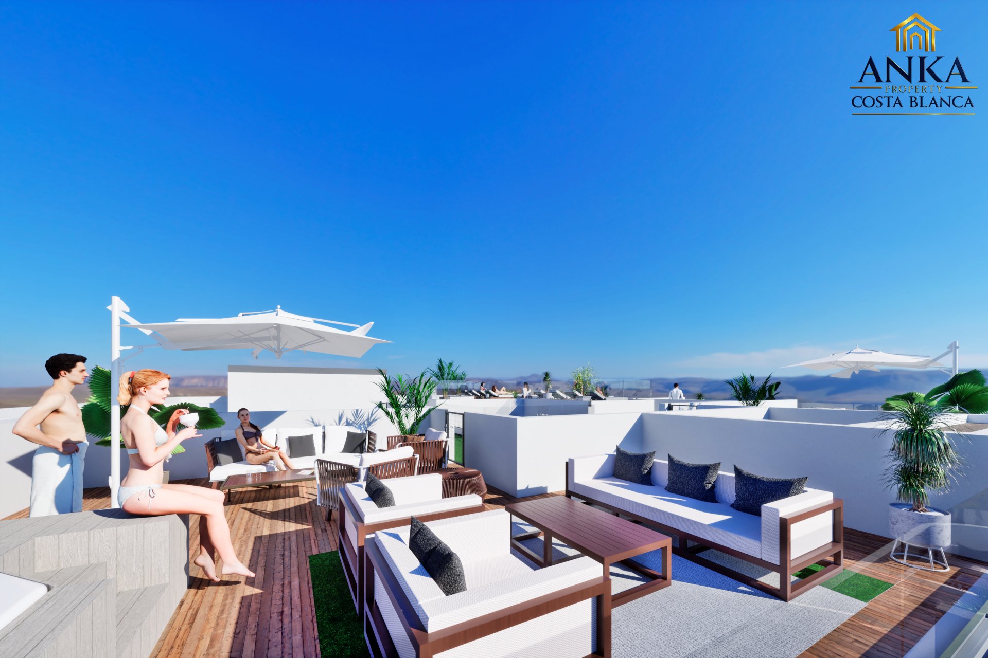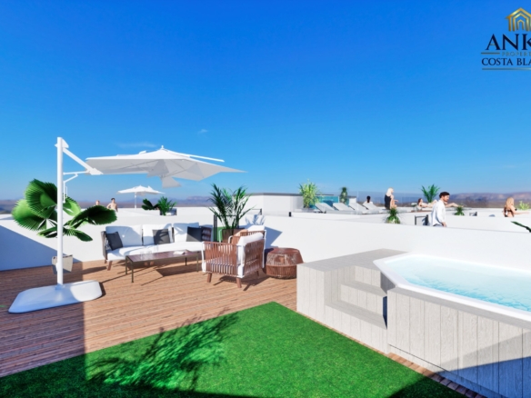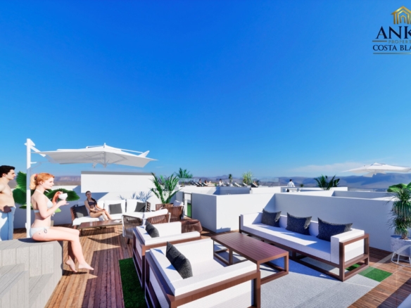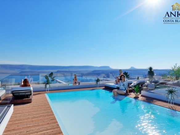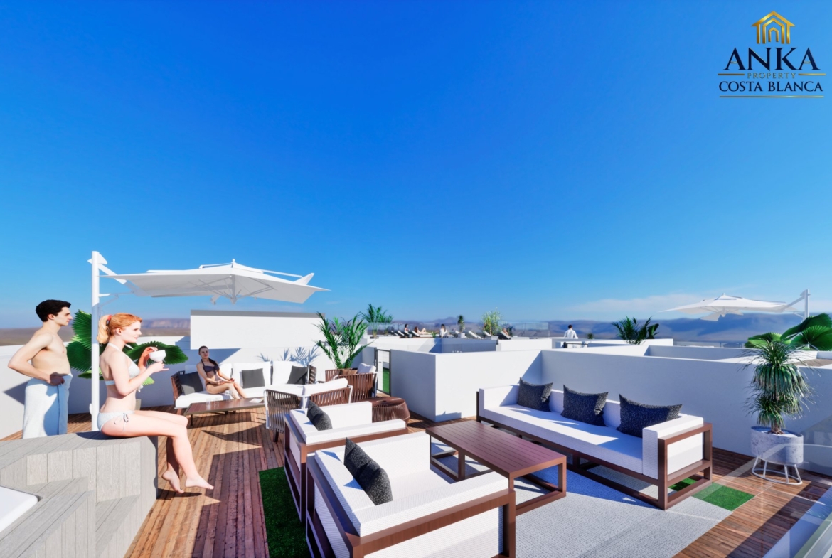 Apartamenty posiadają słoneczne balkony o powierzchni od 8 do 15 m², idealne do relaksu lub spotkań towarzyskich z widokiem na morze. Mieszkania na parterze mają prywatne patia z bezpośrednim dostępem z sypialni lub korytarza. Inwestycja oferuje również spektakularną wspólną strefę na dachu z basenem, sauną, tarasami do opalania i łazienką, co pozwala w pełni korzystać z klimatu śródziemnomorskiego.