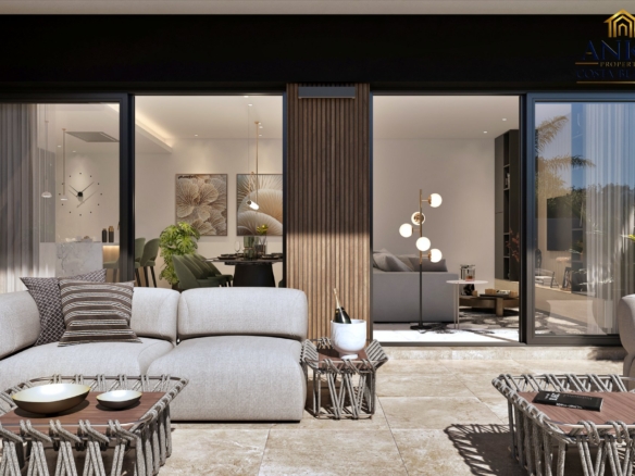The Juliet model features a well-planned, single-level layout covering 107 square meters. Its L-shaped design maximises both space and light, with a bright and airy living area that connects to a modern kitchen complete with a stylish island. Three spacious bedrooms come with built-in wardrobes, while two bathrooms including an en-suite to the master provide both functionality and privacy. Expansive windows throughout allow natural light to pour in, while also offering direct access to the villa’s private garden, terraces, and pool.
