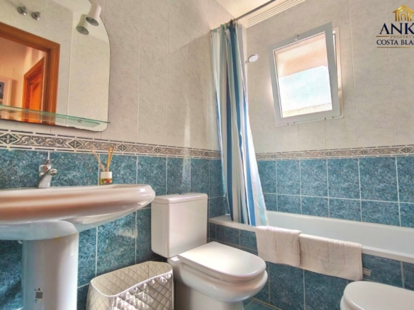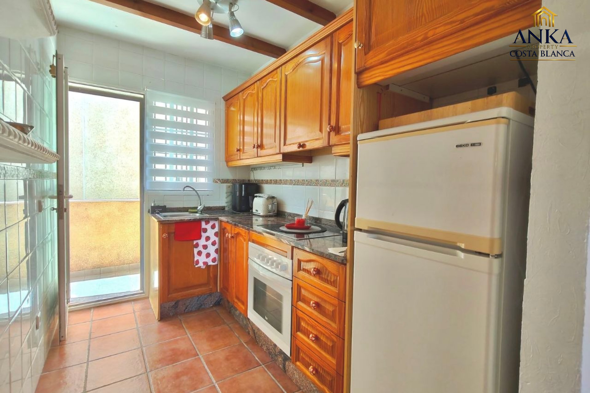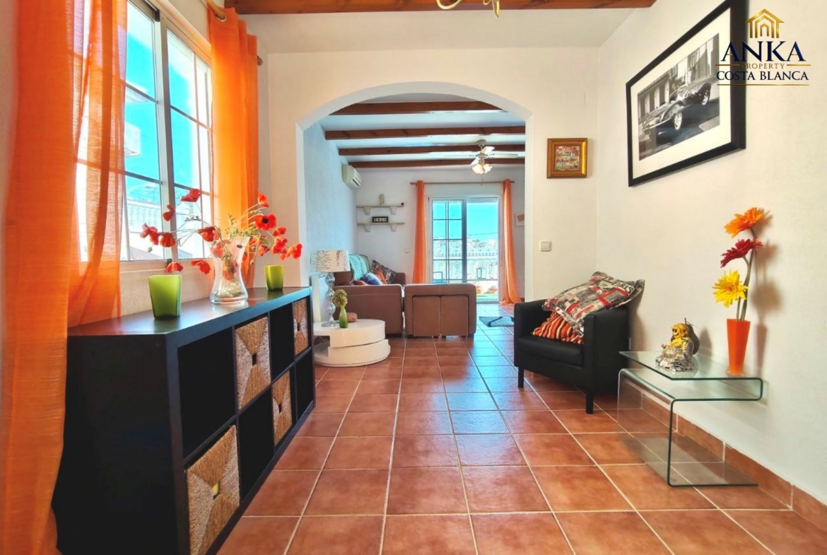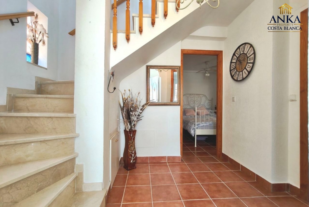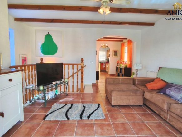 The property is distributed over two levels. On the lower floor, there are two bedrooms and a bathroom with shower. The upper level offers a bright and comfortable living area with lounge, dining space and open plan kitchen, all well connected and with direct access to the garden. The living room also opens onto a pleasant balcony with open views and even a glimpse of the sea on the horizon. This level also includes an additional bedroom and a bathroom with bathtub.