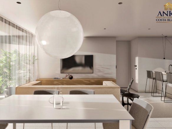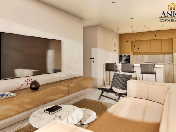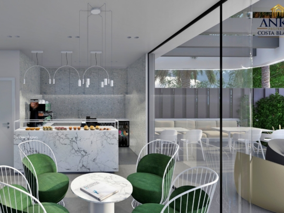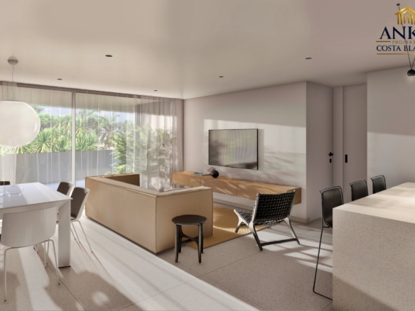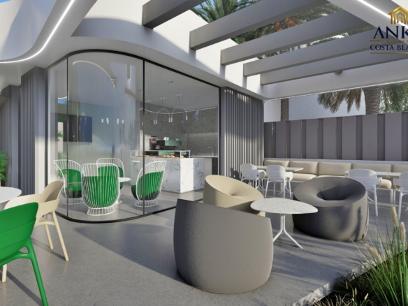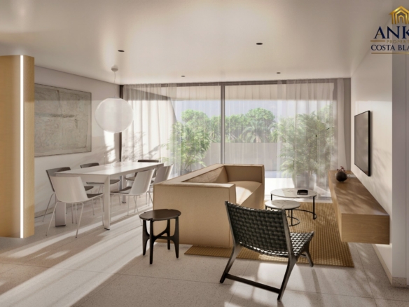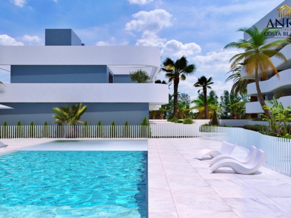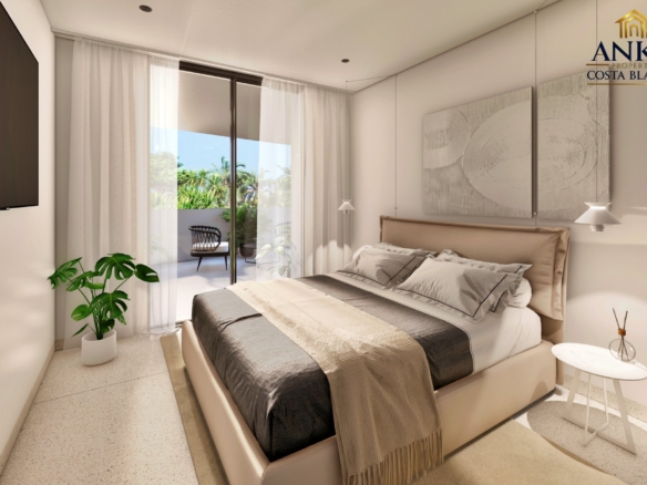 The apartments feature large terraces or private gardens, perfect for enjoying the sun and Mediterranean climate. Penthouses boast expansive solarium terraces, while ground floor units include gardens with direct access to the beautifully landscaped communal areas. Residents can enjoy a saltwater swimming pool, year-round spa, mini-golf, and lush green gardens.
